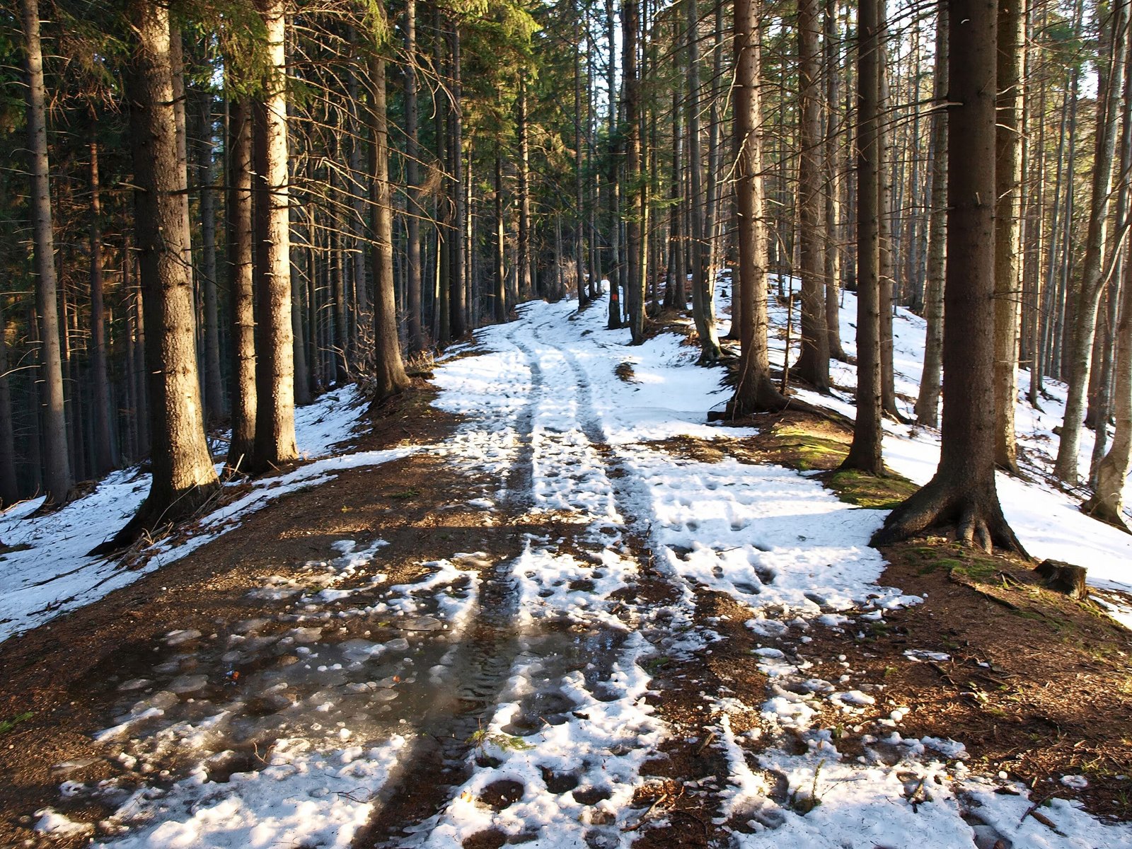 Fotografia este făcut la munte, iarna pe un traseu forestier.